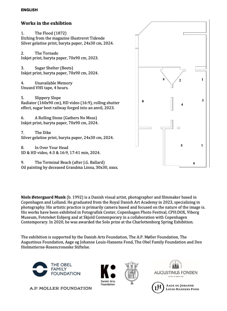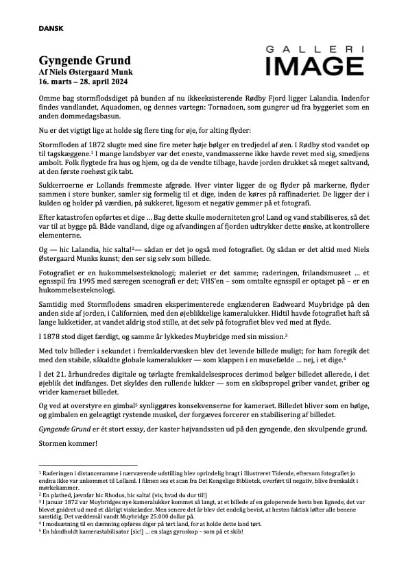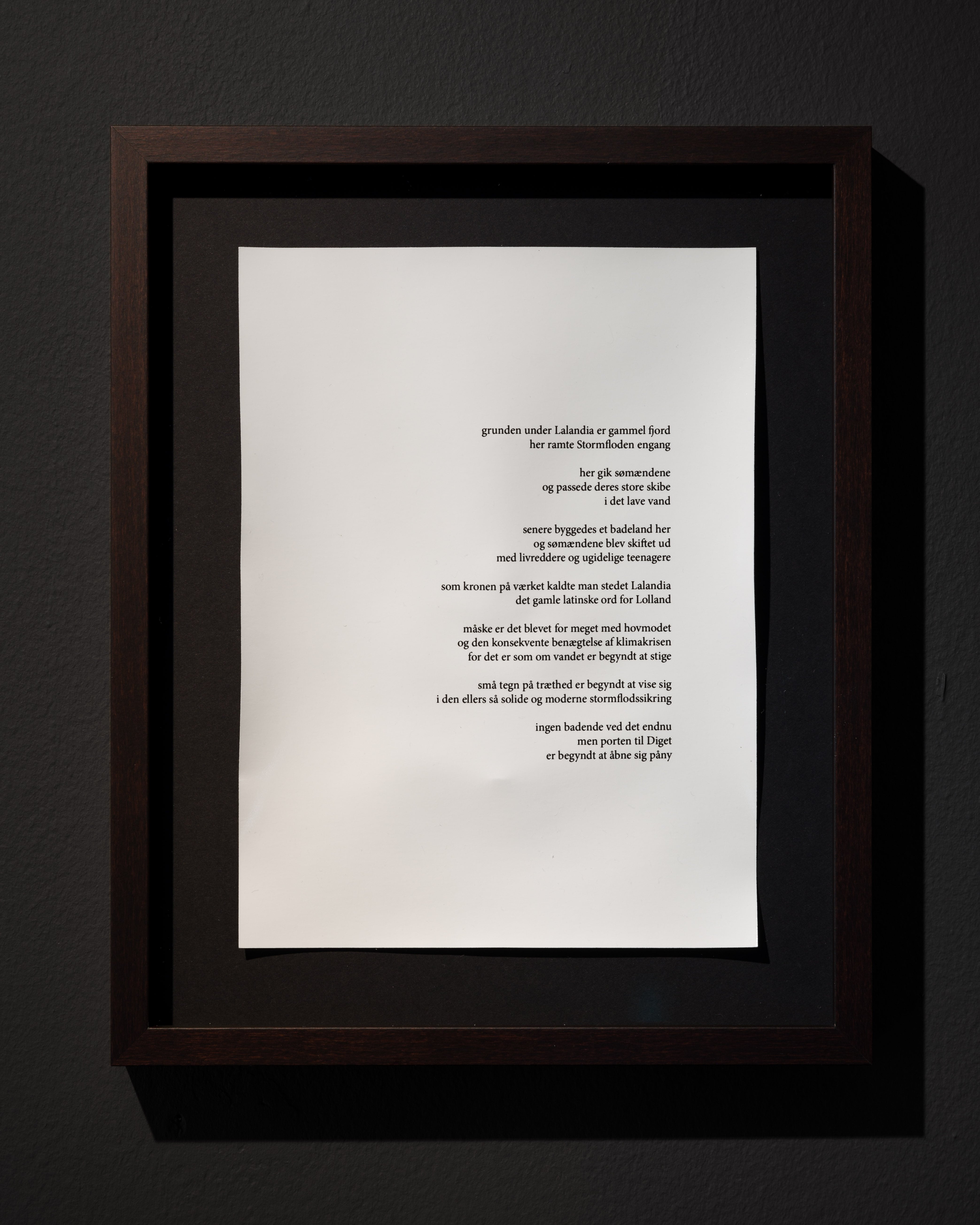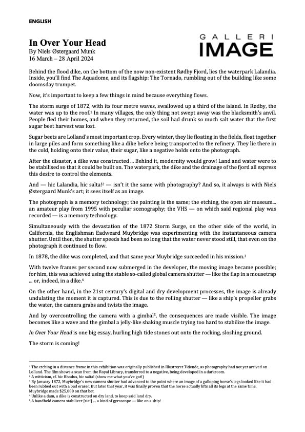 I 1872 så verden det første glimt af et instantant fotografi. Mens vandet fossede ind over den lollandske kyst og tålmodigt oversvømmede øen, lykkedes det på den anden side af kloden, i Californiens tropiske klima, endeligt at fastfryse øjeblikket, at få vandet til at stå stille. Mens stormfloden ramte blev det muligt at bade i den samme flod to gange. At genopleve et øjeblik, et splitsekund, i tidens strøm. Men kameraet var endnu ikke nået til Lolland, så vandet væltede ind, uden at nogen kunne stoppe det i vores hukommelse. Ingen husker de billeder, der aldrig blev taget. Med de nye hurtige kemikalier blev de gamle glaspladenegativer overflødige. Nogle endte endda som ruder i drivhuse. Her sad folk badet i projektionerne af egne og andres begær, længe før Hollywood overhovedet var etableret. Ligesom Lalandia i dag er en tropisk iscenesættelse, et glashus af et imaginært billede, et krystalpalads af et luftkastel, hvor vi kan udleve vores tropiske drømme. Og ligesom der i troperne er orkaner, kan man i Lalandia tage en tur i Tornadoen.